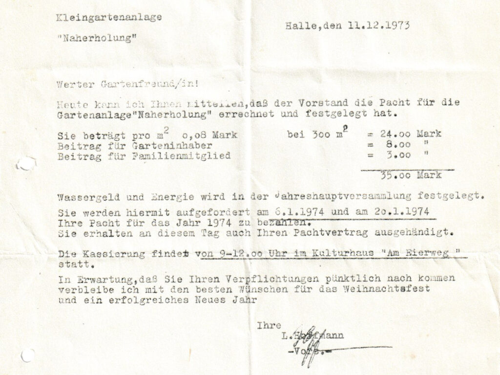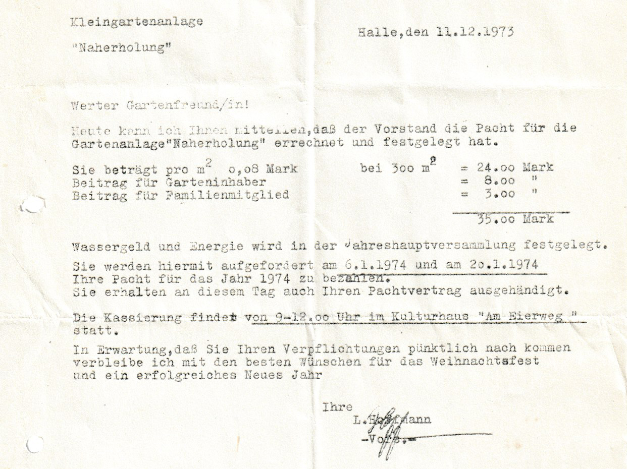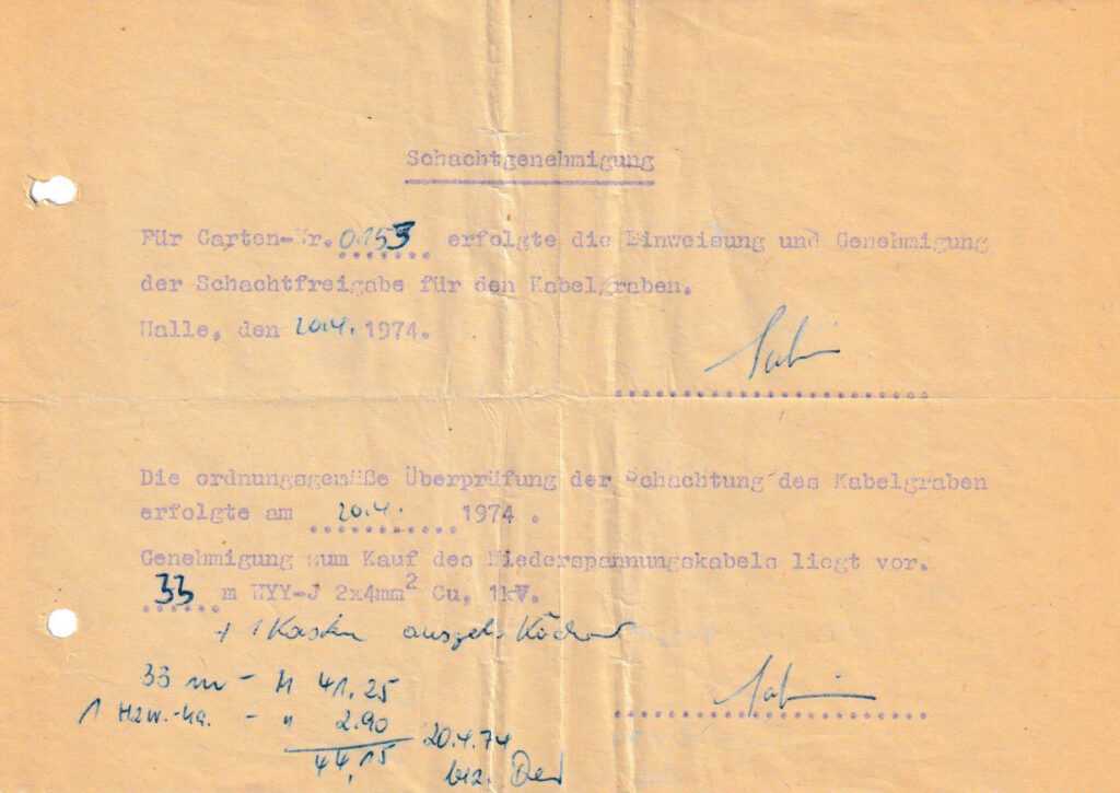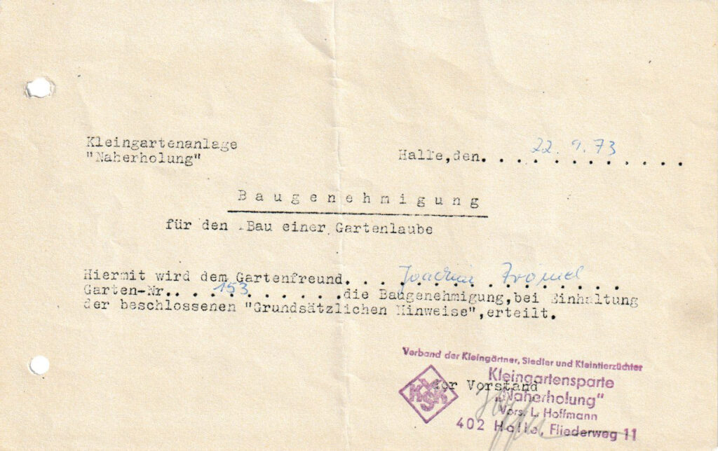 Auch der Laubenbau ging weiter voran, sodass nun in vermehrtem Umfang die entsprechenden Baustoffe wie Zement, Kalk, Sand, Steine etc. benötigt wurden. Den Kalk besorgte Gartenfreund Bernstein aus Buna, Gartenfreund Stabla war wieder für den Transport zuständig. Das Material, das in der Holzbaracke gelagert wurde, wurde von Gartenfreundin Hebenstreit an die Laubenbauer verkauft, die auch eifrig Helfer organisierte, wenn wieder eine Ladung neuen Baumaterials eintraf.