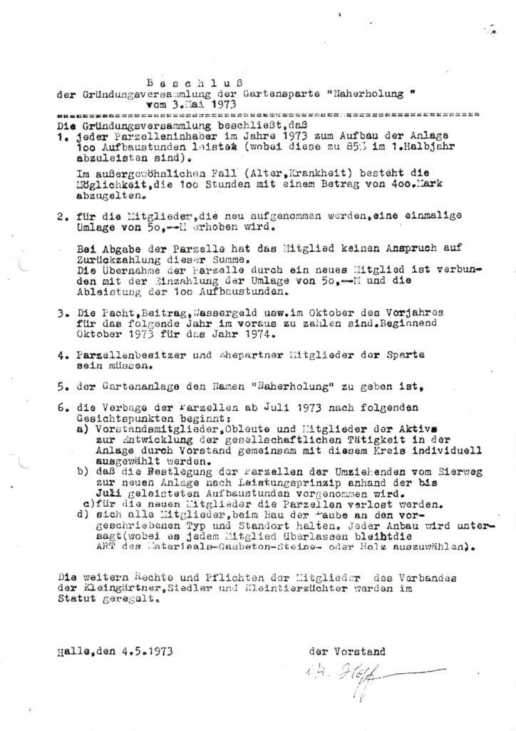 Im Dezember 1971 erfolgte eine Probebohrung für das Loch für die erste Zaunsäule, um die Bodenbeschaffenheit zu prüfen und den zeitlichen Aufwand für die Errichtung des knapp 2 km langen Außenzaunes abzuschätzen. Auf der heutigen Parzelle Nr. 17a wurde im März 1973 unter der Verantwortung von Werner Kuklok ein provisorischer Schuppen, welcher als Materiallager für Kalk, Zement usw. diente, errichtet. Im selben Monat fand die erste Sitzung des Vorstandes, der aus folgenden Mitgliedern bestand, statt: Liesbeth Hoffmann, Hans Bathke, Wilfried Kühn, Reinhold Wilke, Franz Hebenstreit, Horst Kotulla, Irmgard Ludwig, Bruno Sommer, Bruno Hoffmann, Hildegard Hoffmann. Der Vorsitzende der Gartenanlage „Am Eierweg“, Erich Horn, war als Gast geladen. Am 3. Mai 1973 fand die Gründungsversammlung der Gartensparte „Naherholung“ – so hieß die Anlage damals – statt.